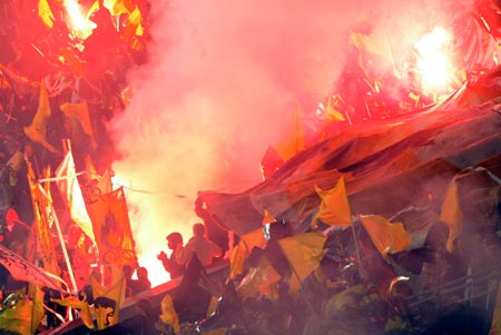 10.000 kronor för användande av pyrotekniska pjäser samt för inkastande av föremål.