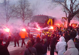 | Klockan 13:23 passerade spelarbussen norra läktaren och fick ett storslaget mottagande. Richard