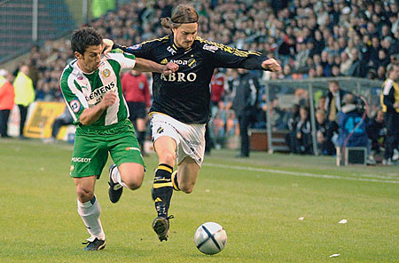 | Andreas Eriksson utmanar Bajenförsvaret. AIK-anfallarens andra derby varade matchen ut, till skillnad
