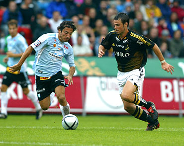 Nya skador värre än förlusten En första halvlek med en viss AIK-dominans, en andra halvlek som förrycktes av skador och en domare som uppträdde som imitatör av Marlon Brando i Coppolas "Apocalypse now". AIK - Malmö FF blev på många sätt en märklig tillställning. AIK inledde med ett rörligt och tämligen snabbt spel, som gjorde att vi vände spelet ovanligt snabbt och flera gånger kunde etablera ett eget spel på MFF:s planhalva, vi hade dock förhållandevis svårt att skapa riktigt klara chanser. Spelarna gav inte upp utan fortsatte sina metodiska försök att öppna MFF-försvaret - vilket inte är det lättaste. Malmö var inte ofarliga, även om de huvudsakligen ägnade sig åt kontringar. Afonso var dock farligt nära målchans vid ett par tillfällen och vid ett tillfälle var det bara en suverän brytning av Nirre Sandberg, som räddade oss. Afonso skulle dock få sin revansch i halvlekens slut, då Nirre blev sen i ett brytningsförsök, hakade upp Afonso som föll. Straffspark, som Niklas Skoog satte säkert. Hemmalaget gjorde en spelmässigt bra insats, inte minst Pa-Modou Kah, som bl a åstadkom 3-4 briljanta framspelningar utan att vi lyckades sätta något mål. De som var närmast nätkänning var Mats Rubarth och Andreas Eriksson. AIK vann skotten med 5-3 i den första halvleken, men hade inte något avslut på mål. Malmö hade ett - straffen! Pa fick en ordentlig smäll under den första halvleken. Det såg inte bra ut och han återkom inte heller efter pausen. Den andra halvleken fick ett delvis annat ansikte, dels beroende på Pas skada, dessutom fick Stefan Ishisaki också en smäll på knät, som gjorde att han fick bryta matchen med en halvtimme kvar att spela. Det skulle bli än värre: i 82:a minuten fick Ruben sin andra varning i matchen och fick alltså lämna plan. Med 10 man på banan gick vi över till en trebackslinje för att försöka nå en kvittering. Visserligen innebar det att Niklas Skoog efter 3½ minuters tilläggstid kunde sätta MFF:s andra mål. AIK ska dock ha en eloge för att man försökte. Närmast ett kvitteringsmål var Arash Talebinejad, som efter ett inspel av Benjamin Kibebe fick till en bra nick vid Aspers vänstra stolp. Asper sträckte ut och lyckades nå bollen. AIK "vann" varningarna med 5-2 och varför vet nog bara domaren. Rubens andra varning kom efter det att han inte hann hålla inne skottet vid en offsideavblåsning eller inte ens hörde den. Det fanns en viss oro hos en stor del av publiken efter HIF-kollapsen, men idag fungerade mittförsvaret igen. Nirre gjorde ett par avgörande brytningar och Pelle Nilsson var en av de för dagen bästa AIK-arna. Håkan var som vanligt, säker, trygg och hela tiden med i spelet. Hans egentligen enda problem kom efter ett skott, vars studs lurade honom, så att han inte fick tag i bollen. Han hann dock själv ta upp returen framför fötterna på Afonso. Pa var utmärkt den halvlek han kunde vara med. Andreas Eriksson var också bra och jobbade hårt hela matchen. Egentligen var han ännu bättre i den andra halvleken, när han lämnade anfallet och gick ner på mitten. Mattias Moström arbetar alltid kollosalt, både framåt och bakåt, men idag fick han ganska få bollar att göra något med. Dessutom hade han klara problem med en duktig Joseph Elanga Tom Prahl var inte särskilt tillfreds efter matchen, utom med segern och att Niklas Skoog fick göra mål. Två stycken dessutom. Men, sa Prahl, man får alltid vara nöjd när man vinner på Råsunda. Patrik Englund var relativt nöjd. Framförallt med det spel vi åstadkom i första halvlek, Sen blev det tufft, beroende på skador och utvisningen. Han var också något förvånad över de varningar vi får, när MFF vid likartade förseelser inte får någon. Visserligen får de ett par kompensationsvarningar senare under matchen, men det gör inte det hela begripligare. Patrik var också nöjd med det hjärta och den inställning, som spelarna visade hela matchen. Han tyckte också att debuterande junioren Patrik Grönvall klarade sig bra i en svår situation och hoppades på att Nick Mrdja kommer att hjälpa till att lösa en del av de offensiva problem AIK faktiskt har. Text: Bappe Bjuggren